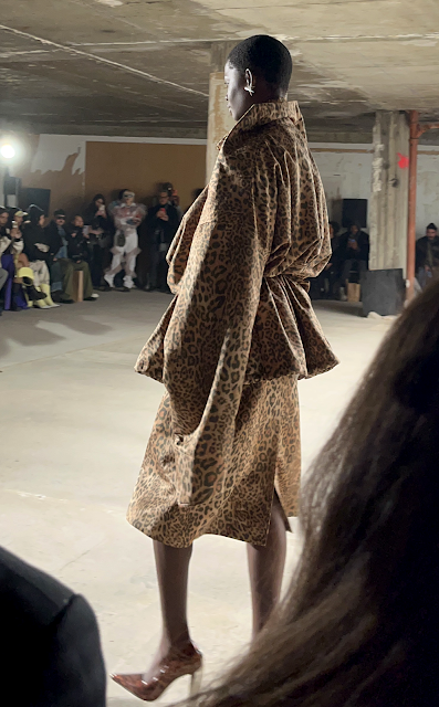We were already familiar with the iconic Bumpy sneaker, but we were captivated by the pointed-toe designs inspired by distressed cowboy boots and mules. The aesthetic felt contemporary and fresh. A standout detail was the Traditional Tibetan robe-inspired draping on coats, sweatshirts, and jackets, with models nonchalantly leaving one arm in the garment, creating a relaxed yet stylish silhouette that exuded individuality and personality. The highlight of this approach was a hooded black denim piece that resembled a hoodie jumper with its draped design. Another favorite look was the burgundy oversized blouse, cinched at the waist with elastic, layered over a flowing red blouse and paired with matching loose pants, a beautifully cohesive and striking ensemble.