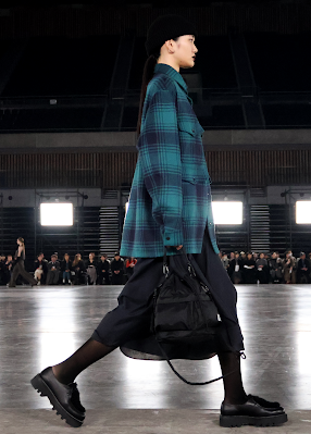The standout pieces included dungarees crafted from plaid fabrics in turquoise and brown, alongside oversized plaid trench coats. Another favorite look was the black fishnet A-line skirt paired with a TNF windbreaker and chunky trail shoes; where streetstyle meets techwear meets fashion. We also loved the brown fluffy wide pants with a high slit, layered with sheer fabric, an unexpected, playful detail that we liked. Overall, the styling, layering, and blend of long and cropped silhouettes were strongly executed. This is what the brand is known for and loved, both inside Japan and beyond.